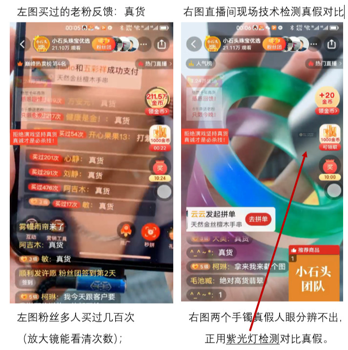 (1)商品链接图(购买者需同意并点击此图才能购买,签订合同) ② 关于100w含义_被比较价格 依据《上海市网络直播营销活动合规指引》第二十条(规范促销活动)应当明确标示或者通过其他方便消费者认知的方式表明被比较价格和销售价格。 本案属于商家促销活动: 《判决书》第9页,“直播间左上角显示:暴力打假!做真货太难了,再见了4年货盘,最后清仓!” ——“清仓”属于促销活动,最后清仓——更大的促销活动。 图中显示与直播间宣讲符合上海地方法规。 所以,“100w”是被比较价格,原价、实际价值(直播录像宣讲证据亦能证明),买家能看懂。 ③ 商品链接图内的文字展示要约部分内容,与主播口播和商品实物展示介绍的内容合在一起构成完整要约,用户选择该商品并提交订单成功时,合同成立。 ④ 这张图就是本案书面合同极简版,这是对所有购买者都一样的格式条款。 其包含的内容有:标的物(保险柜内),产地缅甸,品质a货高货翡翠,价值100w(w__万的网络表达方式),价款1199元。 商家宣传的要约内容条款对每位购买者都是一致的(包括主播口述和屏幕右下角商品联接图等),该条款被直播间购买者多人先后重复使用,该条款是商家事先设计好的(脚本),并且未与买家协商;在直播售货中,买家只能选择接受或拒绝整个要约(合同条款),而不能进行个别协商和改变条款。所以在直播间达成的合同是格式条款合同。 《民法典》第496条 格式条款是当事人为了重复使用而预先拟定,并在订立合同时未与对方协商的条款。 (3)商品快照图(↑10. (4)④): ① 核对交易细节时,可作为判断依据。 用价格,买规格。 (i)已选规格: 100w_本案标的物价值、标价、市场价、原价等;缅甸_商品产地;a货高货冰种_商品品质;5件_包装盒内商品数……;|||规格_标的物 (ii)该规格价格:¥1199.||| 价款 用价款买标的物。 这些文字构成合同的主要内容,核心意思是:标价100w(万)的缅甸A货高货冰种翡翠套装售价1199元。|||(格式条款) 商品价值(标价、原价、被比较价格)100w、一百万。 (4)至此,书面合同成立 证据已可以证明“标价100w(万)的缅甸A货高货冰种翡翠套装售价1199元”合同成立。 (5)判决认定合同为真货合同——天然缅甸A货。 《判决书》第16页,对此本院认为,……由此可见,……原告与被告时B达成的系三份“1199元购买达到百万级别天然缅甸A货”的合同,……本案合同订立后,被告时B向原告发送了三套工艺品翡翠。 (6)判决继续再次认定原告欲购买真的缅甸A货翡翠。 《判决书》第18页,对此本院认为,原告欲向被告时B购买真的缅甸A货翡翠,但被告时B实际向原告发送的是工艺品翡翠,该以假充真的行为构成欺诈;||| 原告谈合同违约,法官故意说欺诈。 (7)被告2相信原告相信真货 《笔录3》第17页,被2代:原告相信购买时翡翠是真的。||| 无欺诈。 (8)判决认定原告相信是真货 《判决书》第18页,本院认为,……本案中,被告时B向原告隐瞒了案涉商品实际为工艺品翡翠的真实情况,并虚构案涉商品为缅甸A货翡翠的虚假事实,足以使原告误以为系缅甸A货翡翠而进行购买。…… 一审认定原告欲购买真的缅甸A货翡翠,原告对被告宣传误(信)以为A,说明原告并不知情,原告属于合理信赖。合同合法有效。 (9)真的是真货 被告1在直播间展示的是真货!直播间现场检测鉴别真假。 《判决书》第12页尾部,另查明,……“给你看看真货和假货的区别……支持检测假一赔三,如果买到假的赔六百万,我说的,录屏,截图”。此外,被告时B还在其他案外直播时陈述:“所有所有人每天都有人录我的视频对吧,我的直播全程有回放,所有姐姐所有粉丝你们放心,每一句话我说到做到,五年前说的我作数,五年后说的我也作数”。 因为被告1直播间是打假直播间(↓27. (4)相信,图),他的商品在直播间通过技术手段现场检测展示给大家,并且与假货对比,非常真实。《判决书》第4页,“粉丝说检测真货视频”【证据13】。
